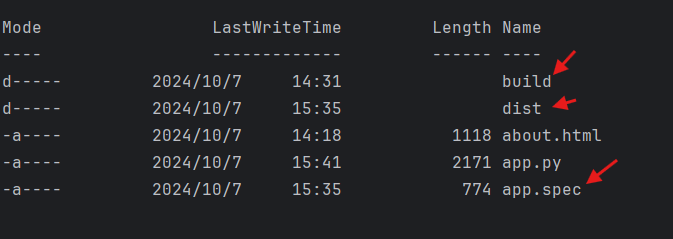 build/:该目录用于存放打包过程中生成的一些中间文件,一般无需过多关注。dist/:该目录用于存放打包的结果产物,我们需要的二进制可执行文件就将被放到这个命令下app.spec:*.spec文件时打包配置文件,该文件记录了打包所使用的参数,运行打包命令后将自动生成该文件。后续可以直接输入pyinstaller app.spec命令打包应用,而无需每次都手动输入参数。